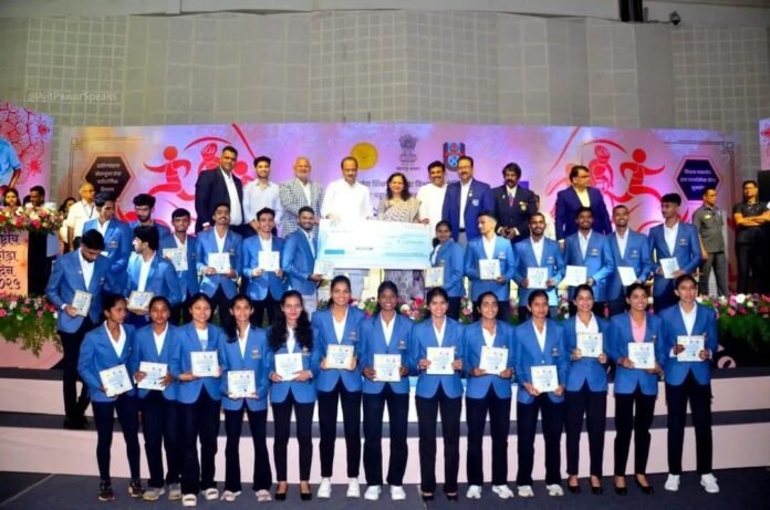 उपमुख्यमंत्री पवार यांच्या हस्ते १३ आंतरराष्ट्रीय व ३१८ राष्ट्रीय स्तरावरील खेळाडूंना पारितोषिके देण्यात आली. सुवर्णपदक विजेत्यांना प्रत्येकी ७ लाख, रौप्यपदक विजेत्यांना ५ लाख आणि कांस्यपदक विजेत्यांना ३ लाख रुपयांचे बक्षीस जाहीर करण्यात आले. कार्यक्रमात “मिशन लक्ष्यवेध हाय परफॉर्मन्स सेंटर” या महत्वाकांक्षी योजनेच्या लोगोचे अनावरणही उपमुख्यमंत्री पवार आणि क्रीडा मंत्री ॲड. कोकाटे यांच्या हस्ते झाले. या प्रसंगी ऑलिम्पिक पदक विजेता स्वप्नील कुसाळे, आमदार बाबाजी काळे, क्रीडा आयुक्त शीतल तेली-उगले, सहसंचालक सुधीर मोरे, माजी क्रीडा प्रशासक नामदेव शिरगांवकर, प्रशिक्षक संजय शेटे आदी मान्यवर उपस्थित होते. उपमुख्यमंत्री पवार म्हणाले की, महाराष्ट्राच्या खेळाडूंनी सलग दुसऱ्यांदा राष्ट्रीय क्रीडा स्पर्धेत पदकांचे द्विशतक झळकावले आहे, जे राज्याच्या क्रीडा परंपरेला अभिमानास्पद आहे. “खेळाडूंच्या मेहनतीतून राज्याला मिळालेले यश हे १३ कोटी महाराष्ट्राच्या जनतेचे सामूहिक अभिमानाचे कारण आहे. खेलो इंडियासह इतर आंतरराष्ट्रीय स्पर्धांसाठी क्रीडामंत्री माणिकराव कोकाटे यांनी केलेल्या ५८ कोटींच्या निधीच्या मागणीस तात्काळ मंजुरी दिली आहे. खेळाडूंना आवश्यक त्या सुविधा देऊन महाराष्ट्राने ऑलिम्पिकसह जागतिक स्तरावर वर्चस्व निर्माण करावे, हे आमचे ध्येय आहे,” असे त्यांनी नमूद केले. फेब्रुवारीत उत्तराखंड येथे पार पडलेल्या राष्ट्रीय क्रीडा स्पर्धेत महाराष्ट्राने ५५ सुवर्ण, ७० रौप्य व ७६ कांस्य अशी एकूण २०१ पदके पटकावून प्रथम क्रमांक मिळविला होता. या यशाचे स्मरण करत राज्य सरकारने ३१८ राष्ट्रीय विजेते व १३ आंतरराष्ट्रीय विजेते खेळाडूंचा गौरव केला. राज्याच्या क्रीडा धोरण २०१२ नुसार खेळाडू व मार्गदर्शकांना एकूण २८ कोटी ७० लाख रुपयांची पारितोषिके वितरित करण्यात आली.