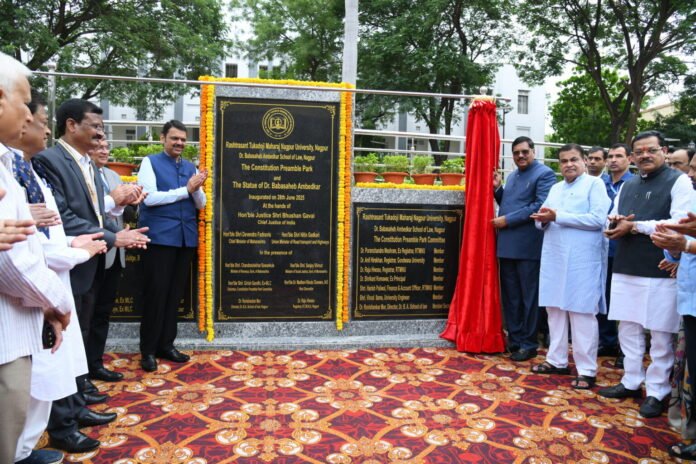 राष्ट्रसंत तुकडोजी महाराज नागपूर विद्यापीठाच्या डॉ. बाबासाहेब आंबेडकर स्कूल ऑफ लॉच्या परिसरात संविधान उद्देशिका पार्क आणि डॉ. बाबासाहेब आंबेडकर यांच्या पूर्णाकृती पुतळ्याचे लोकार्पण सर्वोच्च न्यायालयाचे सरन्यायाधीश भूषण गवई, केंद्रीय रस्ते वाहतूक व महामार्ग मंत्री नितीन गडकरी आणि मुख्यमंत्री देवेंद्र फडणवीस यांच्या हस्ते झाले, त्यावेळी ते बोलत होते. मुख्यमंत्री फडणवीस म्हणाले, डॉ. बाबासाहेब आंबेडकर विधी महाविद्यालयात भारतीय संविधानाचे धडे गिरविले व संवैधानिक मूल्य कृतीमध्ये आणले त्याच महाविद्यालयात संविधान उद्देशिका पार्क आणि डॉ. बाबासाहेब आंबेडकर यांच्या पूर्णाकृती पुतळ्याचे अनावरण होत आहे, ही अत्यंत महत्त्वाची व समाधानाची बाब आहे. संविधानाच्या अमृत महोत्सवी वर्षात या पार्कची कार्यपूर्ती होऊन जनतेसाठी खुला होत आहे ही त्यातही महत्त्वाची बाब आहे. भारतीय संविधानाने सक्षम लोकशाहीची रचना करुन येथील नागरिकांना अभिव्यक्ती स्वातंत्र्य, मूलभूत अधिकार, समान संधीचा अधिकार व न्याय मिळवून देण्याची व्यवस्था केली आहे. यामुळेच संविधानातील मूल्यांवर चालत भारताने जागतिक स्तरावर चौथ्या क्रमांकाची अर्थव्यवस्था होण्याचा मान मिळविला आहे. संपूर्ण संविधान प्रास्ताविका पार्क हा दोन एकर परिसरात ९.५ कोटी रुपये खर्चातून निर्माण करण्यात आला आहे.