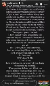 अभिनेत्री हिना खान तिच्या कॅन्सरमुळे अनेकदा चर्चेत असते.हिना खानने नुकतीच एक पोस्ट शेअर केली आहे. यामध्ये तिने भारताला पाठिंबा दिल्यानंतर तिला ट्रोल करणाऱ्या सर्वांना उत्तर दिले आहे. तसेच धमकी देणाऱ्यांनाही सुनावले आहे. हिनाने लिहिले आहे की, “मी एक कलाकार आहे आणि मी आयुष्यभर सीमेपलीकडील लोकांवर प्रेम केले आहे. तुमच्यापैकी अनेकांनी मला शिवीगाळ केली, शाप दिला, ऑपरेशन सिंदूरच्या आधी आणि नंतर माझ्या देशाला पाठिंबा दिल्याबद्दल अनेकांनी मला अनफॉलो केले. इतकेच नाही तर बरेच जण मला अनफॉलो करण्याची धमकी देखील देत आहेत. या धमकीसोबतच, अपमानास्पद, असभ्य आणि अपमानास्पद शब्द देखील आहेत, जे फक्त द्वेष दर्शवतात. आपण माझ्या देशाचे समर्थन करता अशी मी अपेक्षा करीत नाही. आपण आपल्या देशाचे समर्थन करता हे ठीक आहे. परंतु या वेळी आपण कमीतकमी मानवता दर्शविली पाहिजे, मी तुमच्या सर्वांसाठी जितके करीत होतो तशीच वागणूक मला तुमच्याकडून अपेक्षित आहे. पण मला वाटते की हा आपल्यातला फरक आहे. मी नेहमीच प्रथम भारतीय असेन. म्हणून तुम्ही लोक मला अनफॉलो करू शकता, मला त्याची पर्वा नाही. मी तुमच्यापैकी कोणाशीही गैरवर्तन केलेले नाही, मी फक्त माझ्या देशाचे समर्थन केले आहे. पूर्वी हिना खानने असे म्हटले होते की युद्धामध्ये कोणीही जिंकत नाही, फक्त निर्दोष लोक मरतात”, अभिनेत्रीचे हे विधानही बरेच चर्चेत आले होते आणि अनेकांनी तिच्या या विधानाचे कौतुकही केलेले पाहायला मिळाले होते. हिना खान पहलगाम दहशतवादी हल्ला, ऑपरेशन सिंदूर आणि त्यानंतरच्या घटनांबद्दल सोशल मीडियावर सतत लिहित आहे. तिने यापुर्वी आम्ही हिंसाचाराला प्रोत्साहन देत नाही आणि मला माहित आहे की आपण सर्वांना शेवटी शांती आवडते. दहशतवादाचे उच्चाटन करण्यासाठी मी माझ्या देशासोबत जितकी उभी आहे तितकाच तणाव कमी व्हावा अशीही मी इच्छा आणि प्रार्थना करते, अशी पोस्ट केली होती.