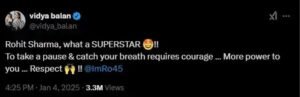सिडनी कसोटीत रोहित शर्मा खेळला नाही. त्याच्या बॅटमधून धावा निघत नसल्याने त्याने या कसोटीतून माघार घेतली. पण अशा स्थितीत रोहित शर्माने एक पीआर स्टंट केल्याचे दावा करण्यात आला आहे. यावरून रोहित शर्माला प्रचंड ट्रोल केले जात आहे. याला विद्या बालन कारणीभूत ठरली आहे. विद्या बालनने तिच्या सोशल मीडिया हँडलद्वारे रोहित शर्माचे कौतुक करताना म्हटले होते, रोहित शर्मा, काय सुपरस्टार!! स्वता: थांबण्याचा निर्णय घेण्यासाठी धैर्य लागते… तुला अधिक बळ मिळो, रिस्पेक्ट!! @ImRo45.” असे ट्विट केले होते. पण विद्या बालनचे ट्विट स्क्रिप्टेड असल्यांचे काही नेटकऱ्यांनी म्हटले आहे. तसेच विद्या बालनने लिहिलेला कंटेन्ट हा रोहित शर्माच्या पीआरने पाठवलेला असल्याचा दावा करण्यात आला आहे. विद्या बालनसोबत रोहित शर्माला सुद्धा ट्रोल करण्यात येत आहे. “तू आधी रोहितला इन्स्टाग्रामवर फॉलो तर कर आणि मग त्याला पाठिंबा दे,” असं म्हटलं आहे. “आता मूळ प्रवाहाबाहेर गेलेल्या कलाकारांकडून क्रिकेटर्सचा पीआर केला जात आहे तर,” असा टोला विद्याला लगावला आहे. दरम्यान विद्याने एकदा फिल्मफेअरच्या मुलाखतीत म्हटले होते की ती जास्त क्रिकेट पाहत नाही, परंतु तिचा आवडता खेळाडू सचिन तेंडुलकर आहे. त्यामुळे देखील विद्या बालन ट्रोल होत आहे.